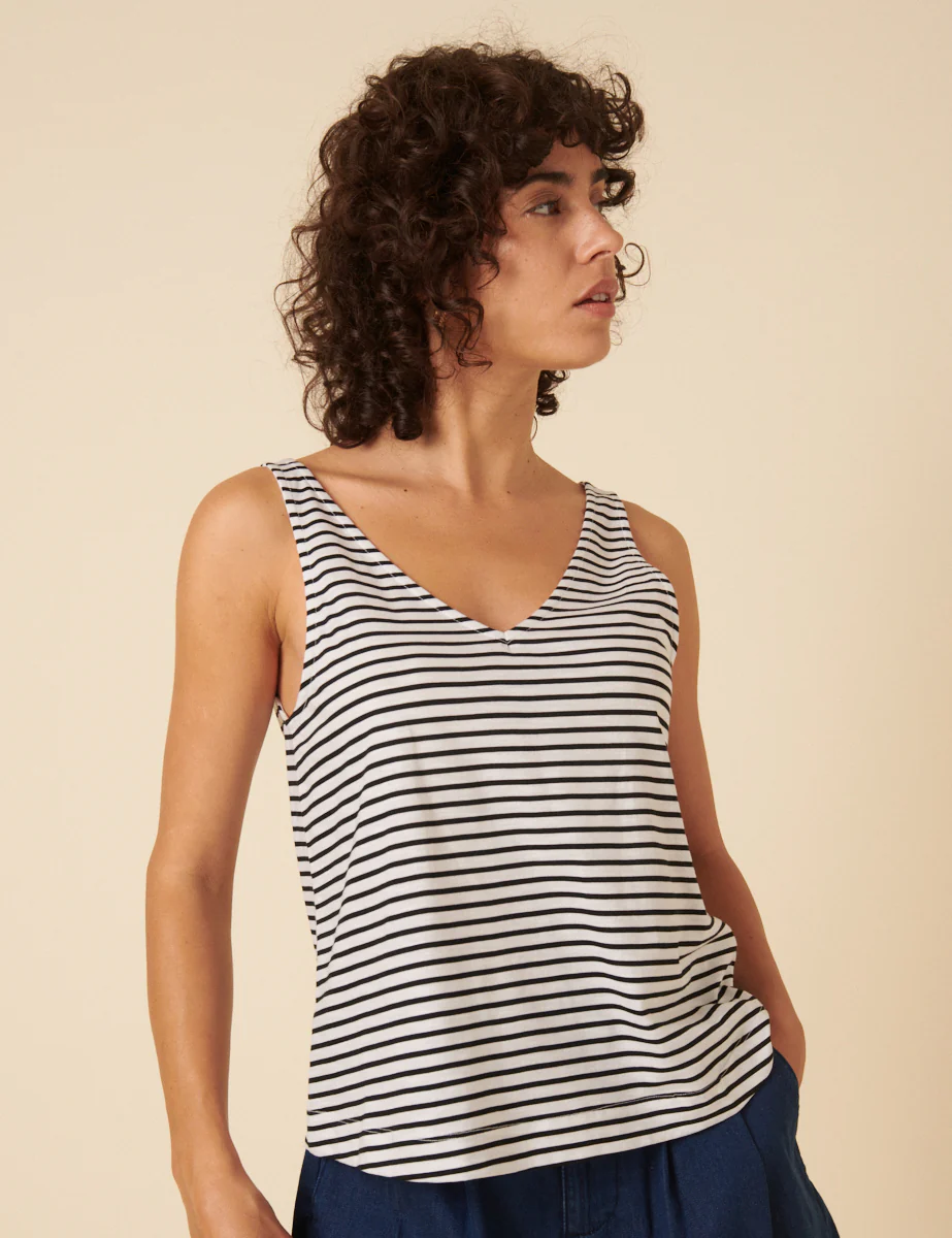 A wardrobe requirement. Coming in classic black and white stripes, our vest is designed with a V-neckline that’s so easy to wear solo or layered under knits. Just add denim.
