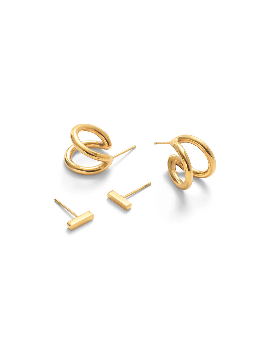 The perfect pairing. This two-piece pack comes with a so-now double hoop design and elegant barely-there bar studs. Coated in a goes-with-everything gold, consider these your new everyday essentials. Wear yours with everything you already own.